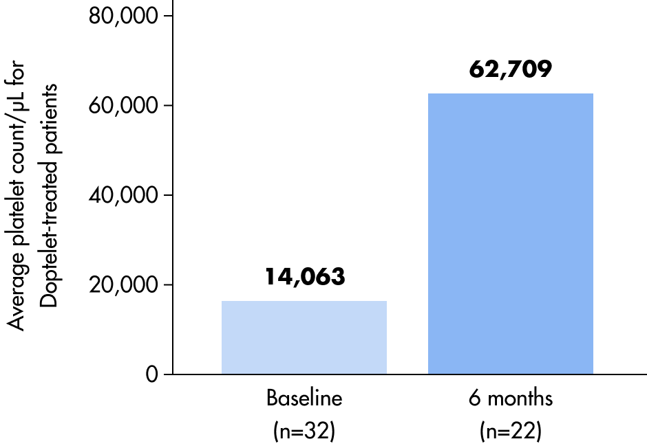Efficacy was evaluated in a 6-month, multicenter, randomized, double-blind, placebo-controlled Phase 3 study. Patients had received one or more prior chronic ITP therapies and had average screening and baseline platelet counts of <30×109/L. Forty-nine patients were randomized (2:1) to receive either Doptelet (n=32) or placebo (n=17).1